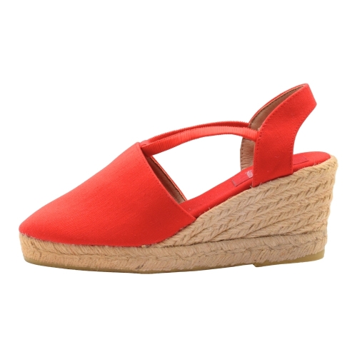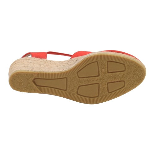 Sandalias con cuña de esparto de 5 cuerdas (5 cm + 2 cm plataforma). Fabricada en material textil. Cierre elástico. Suela de goma antideslizante.