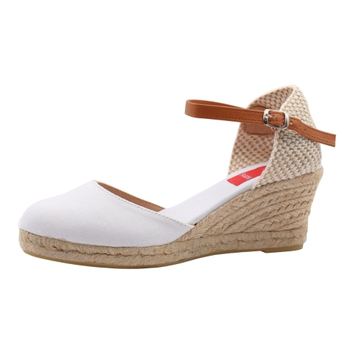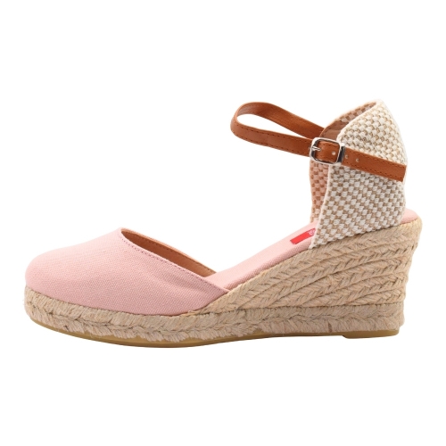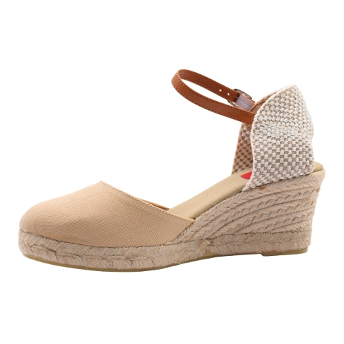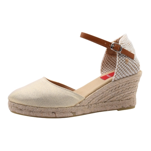 Sandalias con cuña de esparto de 5 cuerdas (5 cm + 2 cm plataforma). Fabricada en material textil. Cierre de hebilla con tira de cuero. Suela de goma antideslizante.