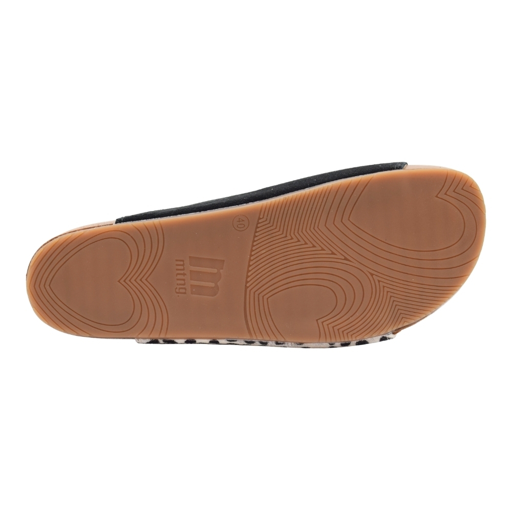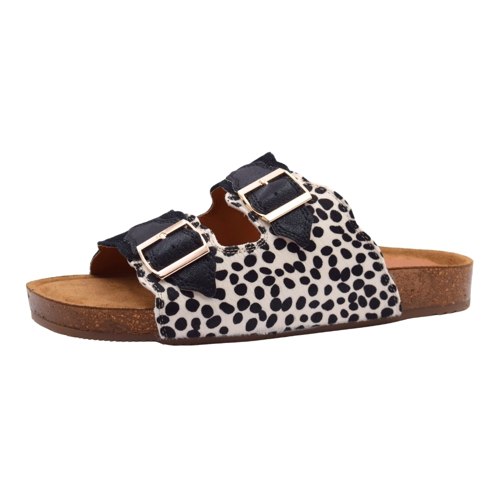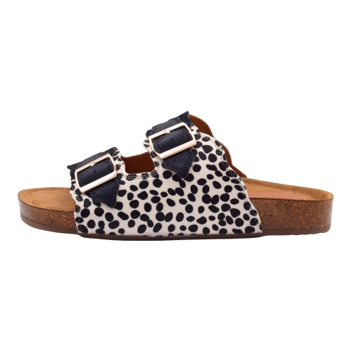 Sandalias MUSTANG planas textiles con hebilla para mujer, color blanco y negro con estampado moteado
