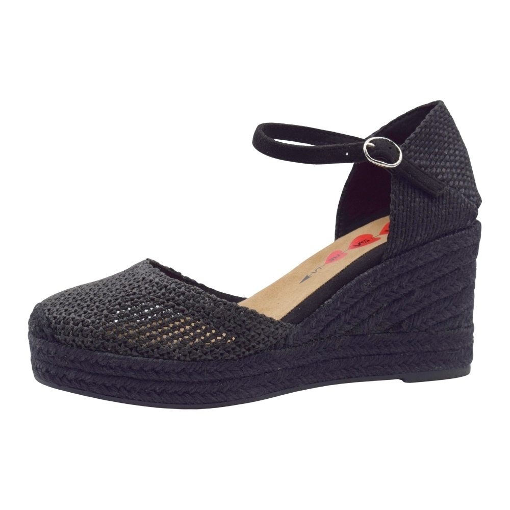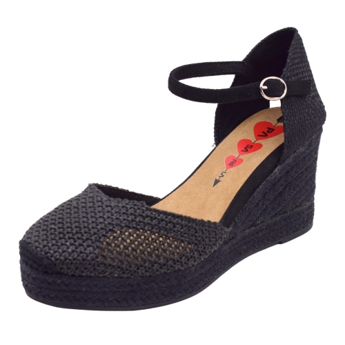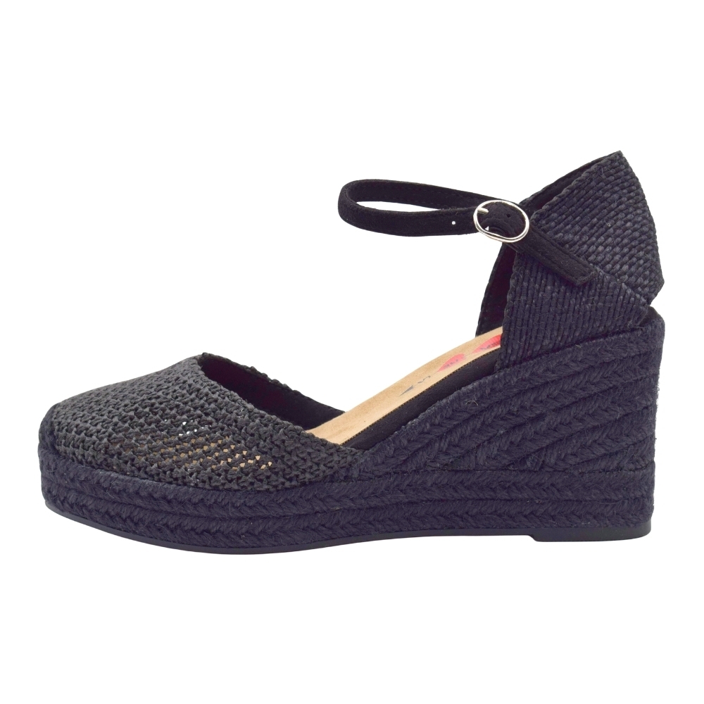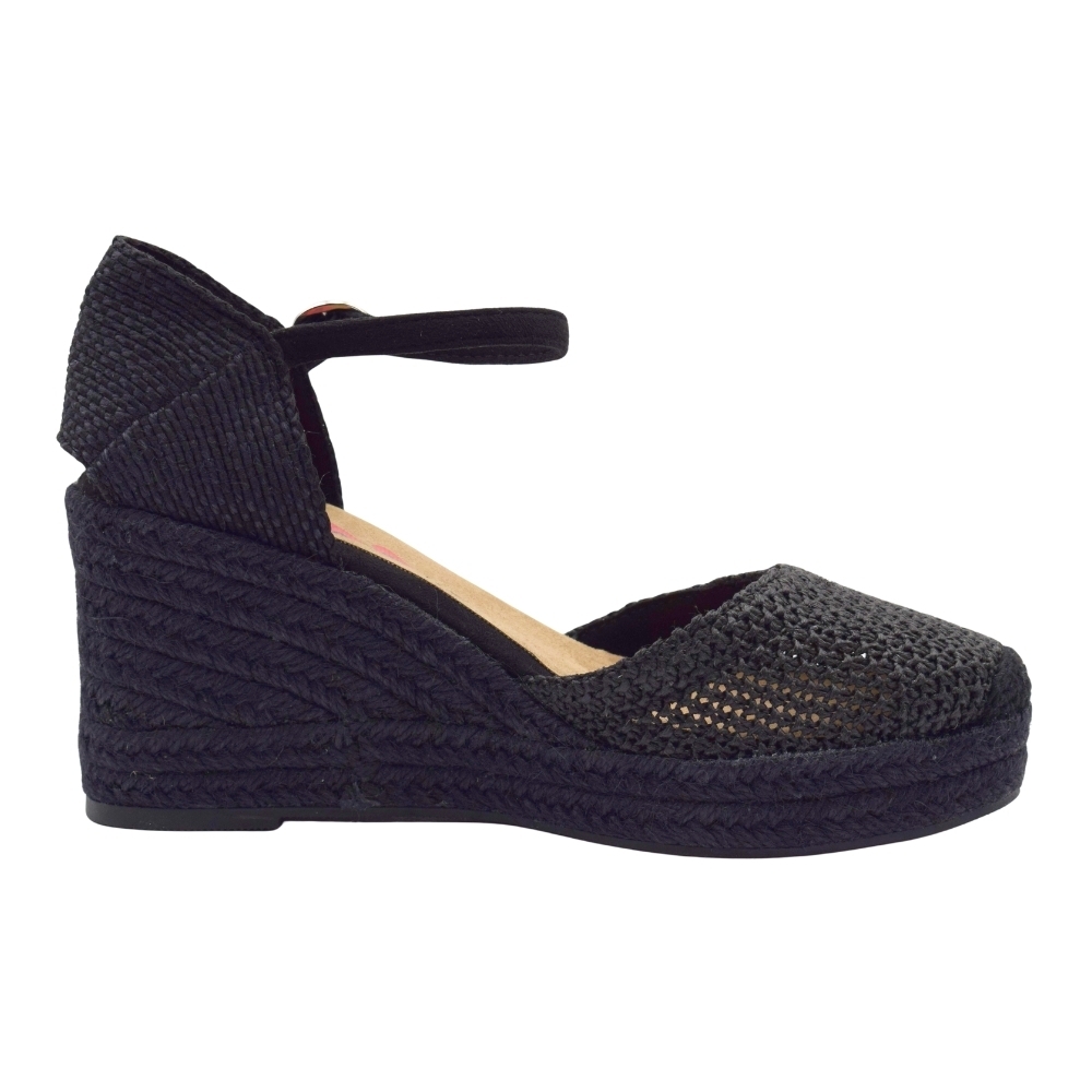 Sandalias valencianas con plataforma y cuña de esparto/yute en color Negro para mujer.