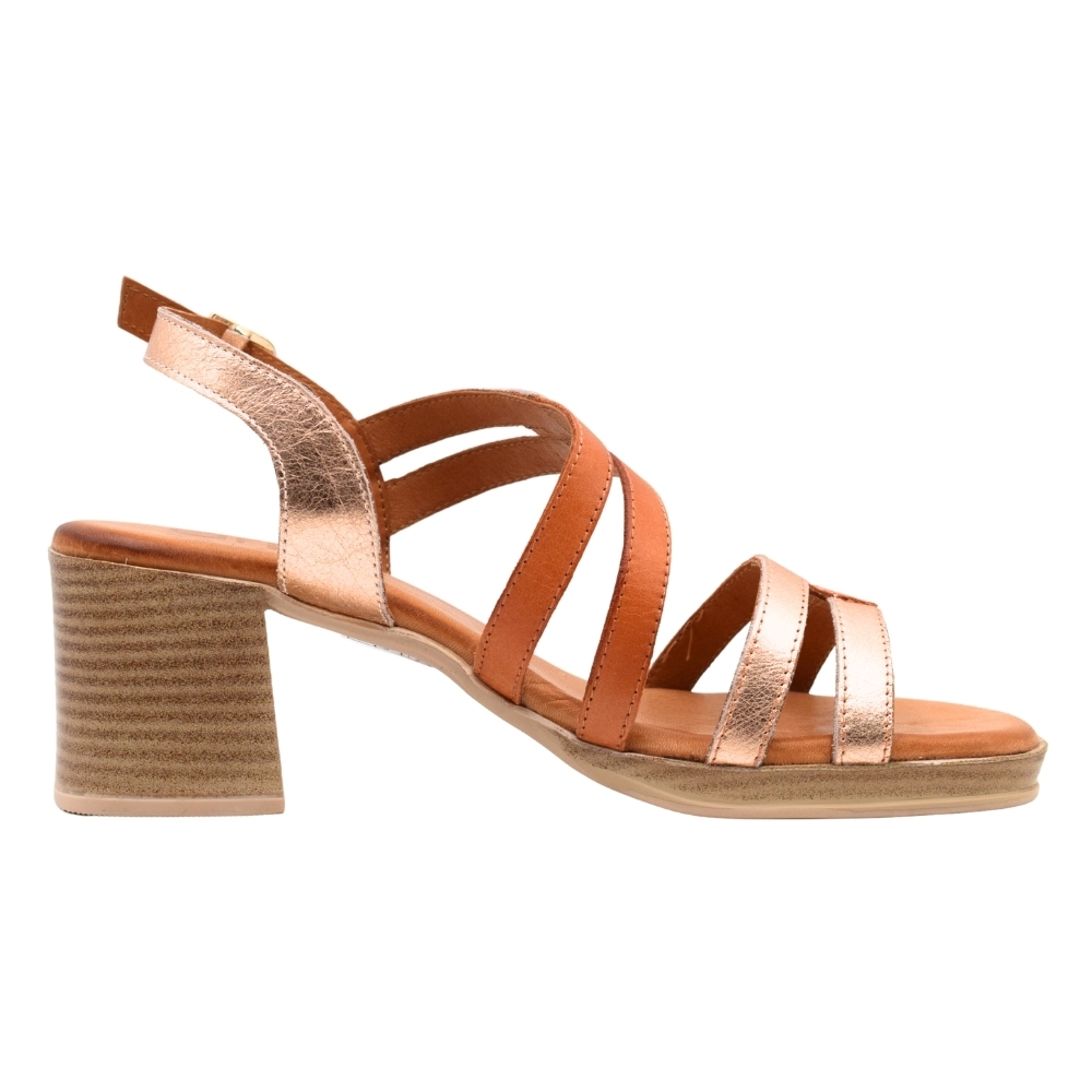 Sandalias PASARELA con diseño de tiras de piel para mujer color marrón cuero y detalles en Rosa Metalizado