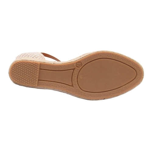Sandalias con cuña de esparto de 3 cuerdas (3 cm + 2 cm plataforma). Fabricada en material textil. Cierre de hebilla con tira de cuero. Suela de goma antideslizante.