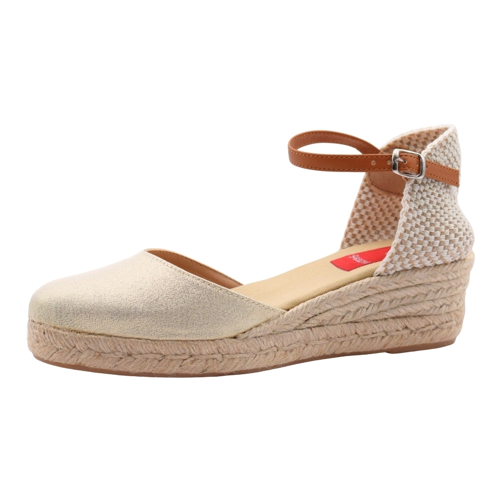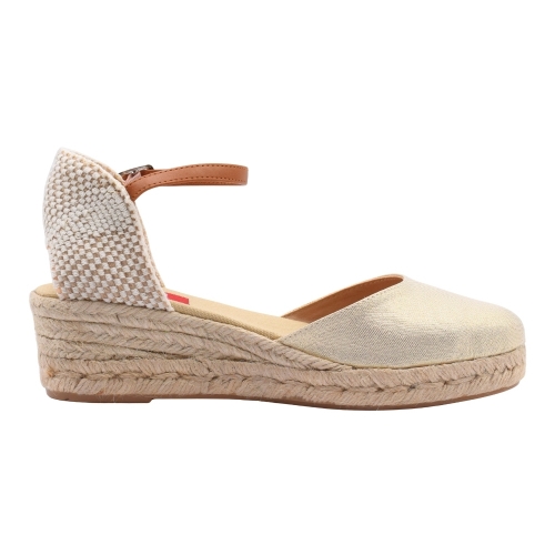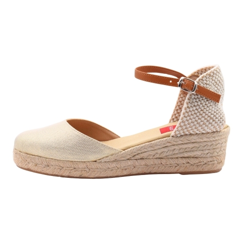 Sandalias con cuña de esparto de 3 cuerdas (3 cm + 2 cm plataforma). Fabricada en material textil. Cierre de hebilla con tira de cuero. Suela de goma antideslizante.