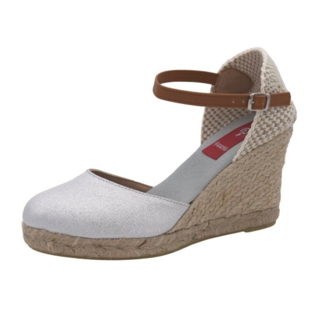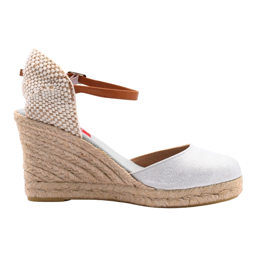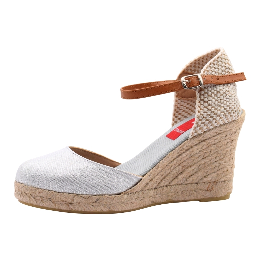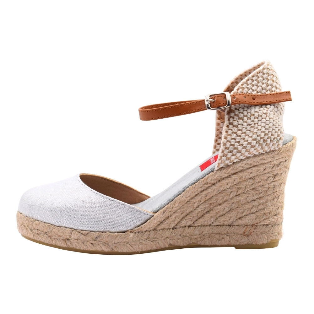 Sandalias con cuña de esparto de 7 cuerdas (7 cm + 2 cm plataforma). Fabricada en material textil. Cierre de hebilla con tira de cuero. Suela de goma antideslizante.