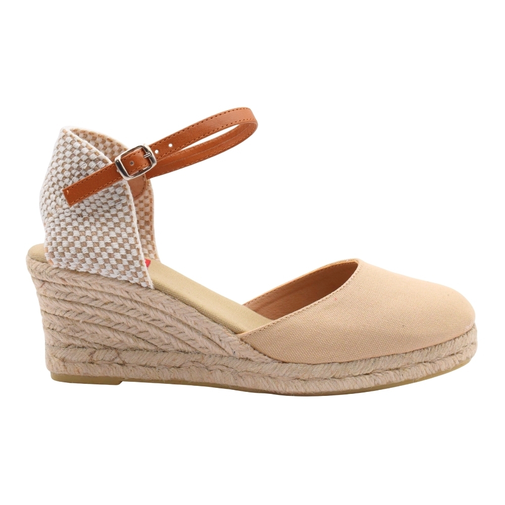 Sandalias con cuña de esparto de 5 cuerdas (5 cm + 2 cm plataforma). Fabricada en material textil. Cierre de hebilla con tira de cuero. Suela de goma antideslizante.