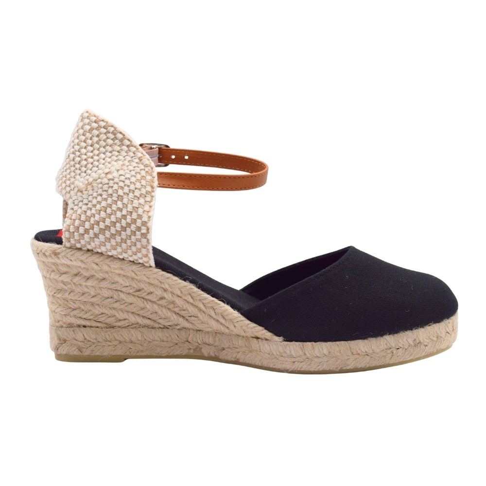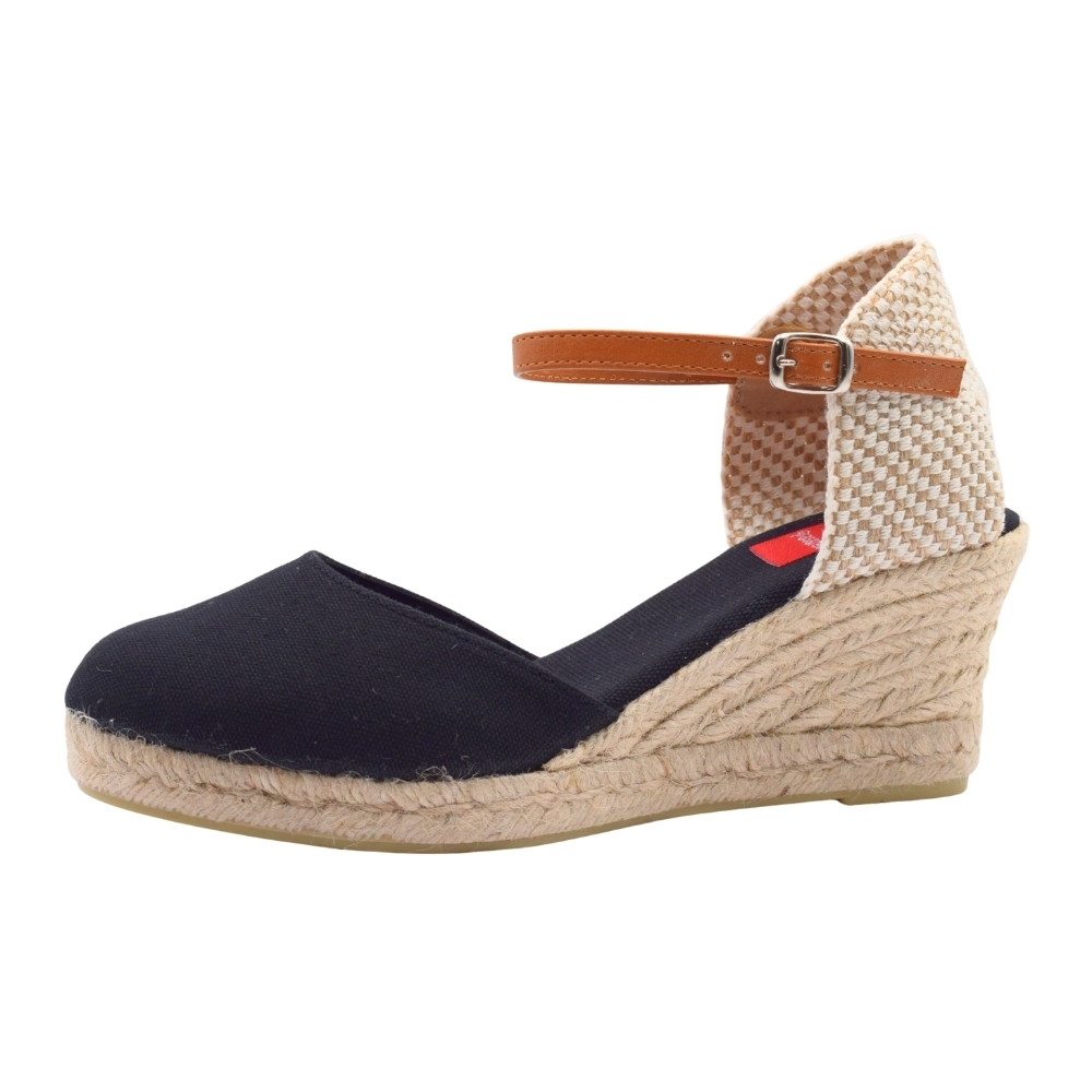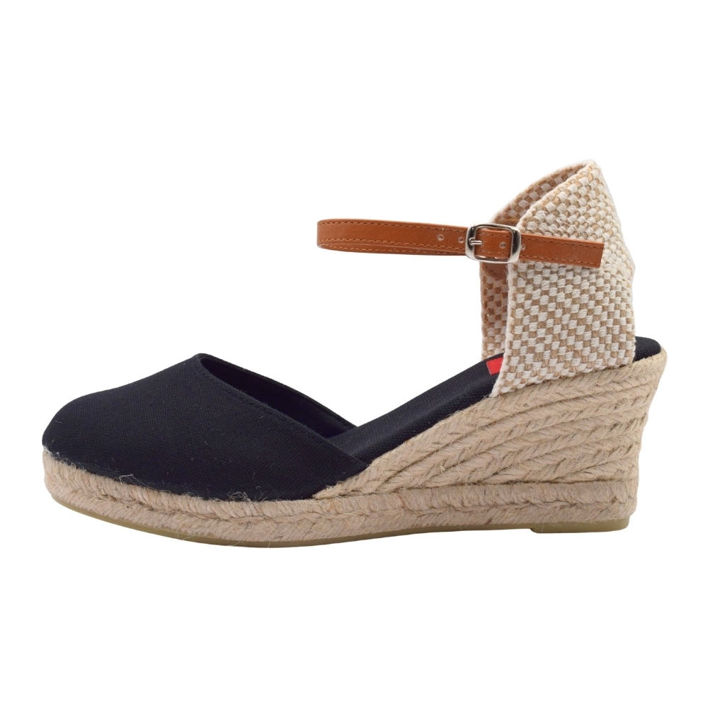 Sandalias con cuña de esparto de 5 cuerdas (5 cm + 2 cm plataforma). Fabricada en material textil. Cierre de hebilla con tira de cuero. Suela de goma antideslizante.