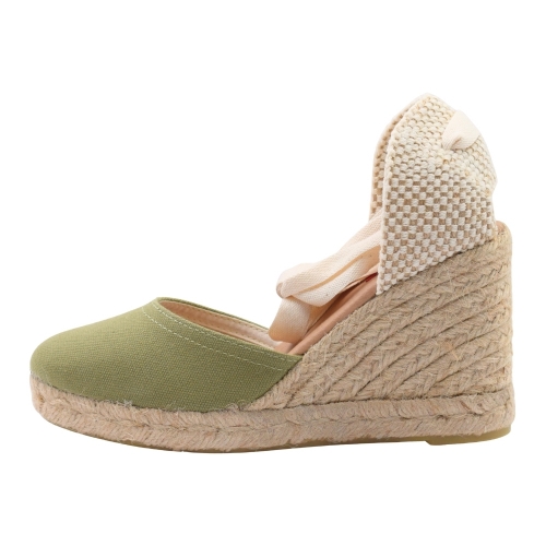 Sandalias con cuña de esparto de 7 cuerdas (7 cm + 2 cm plataforma). Fabricada en material textil. Cierre con lazos color blanco. Suela de goma antideslizante.