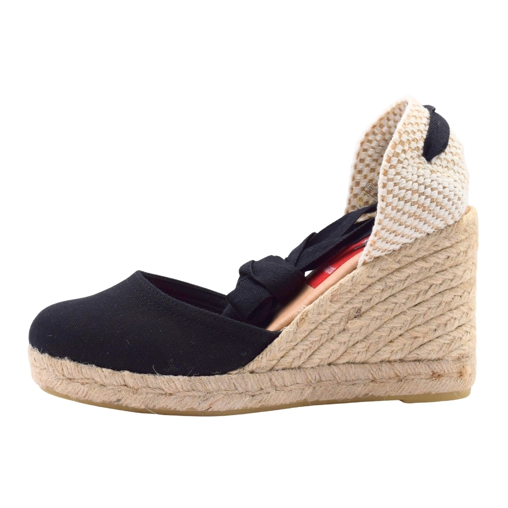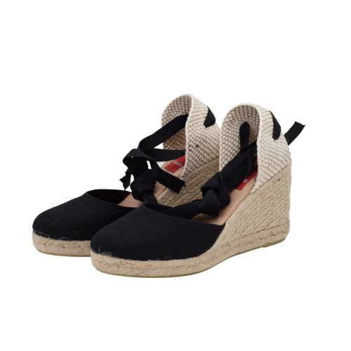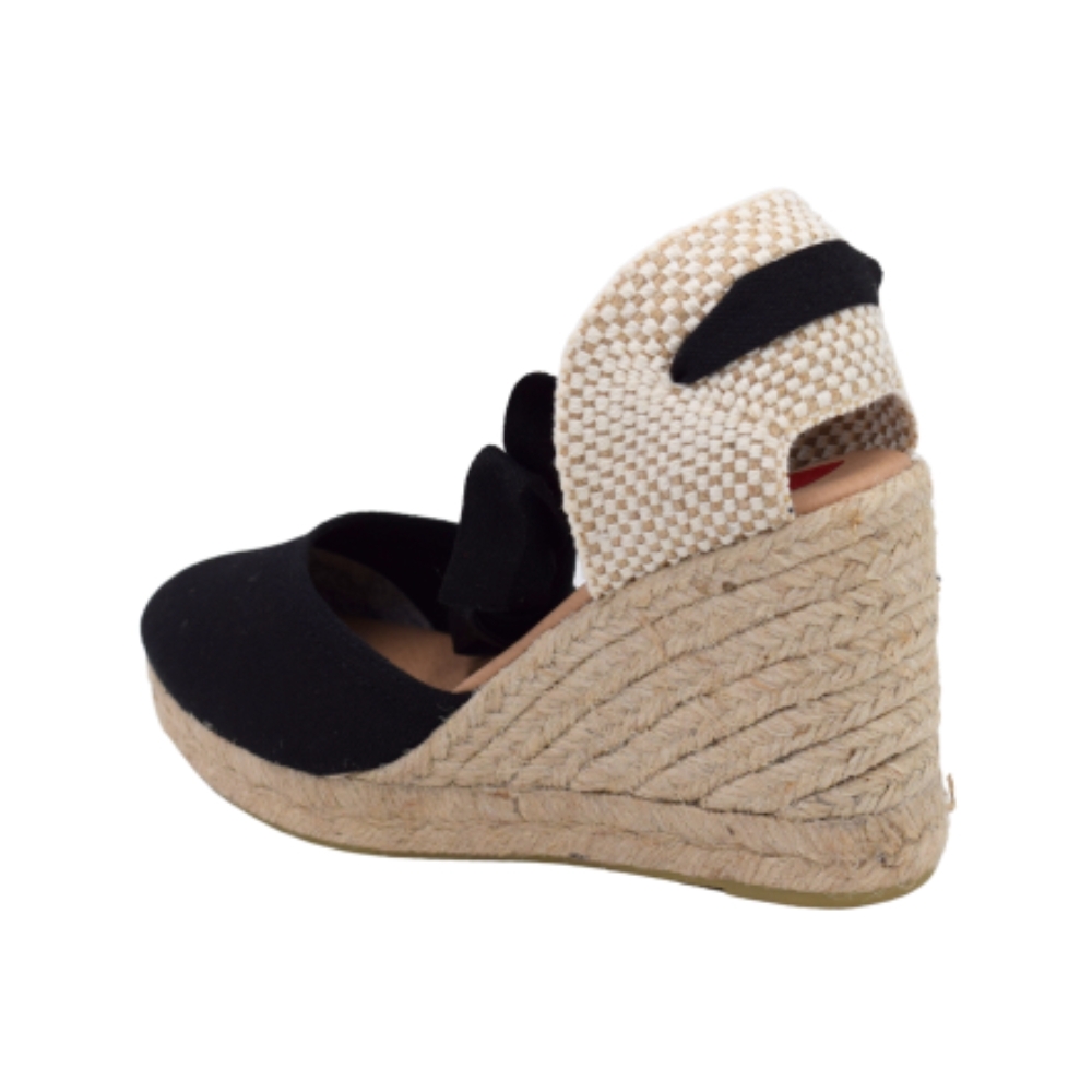 Sandalias con cuña de esparto de 7 cuerdas (7 cm + 2 cm plataforma). Fabricada en material textil. Cierre con lazos color negro. Suela de goma antideslizante.