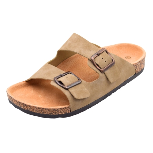 Sandalias STAY planas textiles con hebilla y tachuelas para mujer, color Taupe