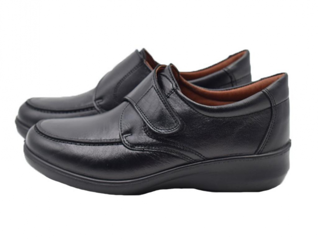 Mocasines LUISETTI fabricados en piel para mujer. Mocasines muy cómodos aptos para uso 24 horas, hostelería, etc. Con suela de goma antideslizante a pisos húmedos y plantilla interior extraíble. Con velcro lateral regulable. Color Negro