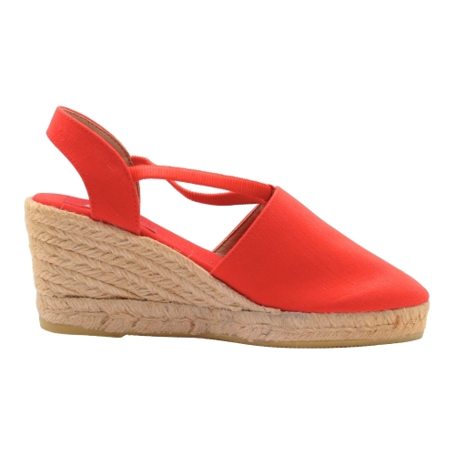 Sandalias con cuña de esparto de 5 cuerdas (5 cm + 2 cm plataforma). Fabricada en material textil. Cierre elástico. Suela de goma antideslizante.