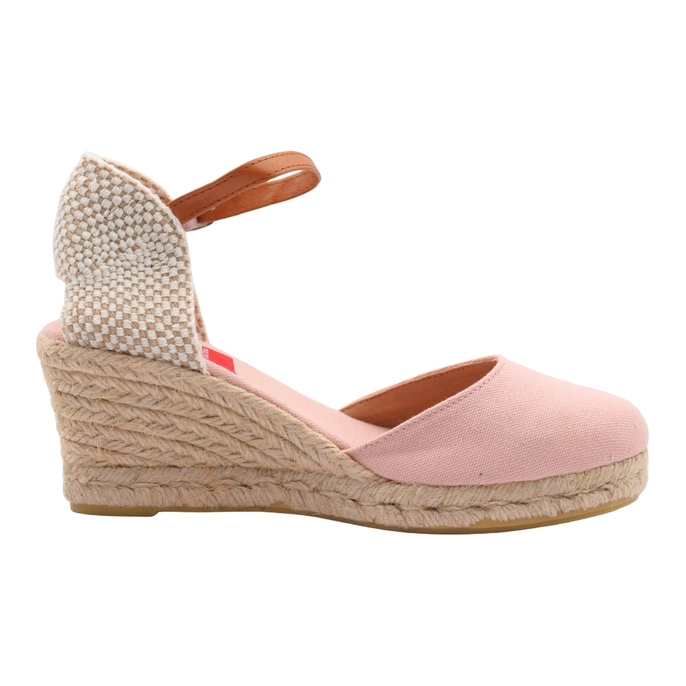 Sandalias con cuña de esparto de 5 cuerdas (5 cm + 2 cm plataforma). Fabricada en material textil. Cierre de hebilla con tira de cuero. Suela de goma antideslizante.