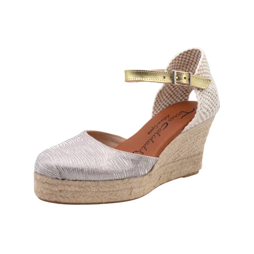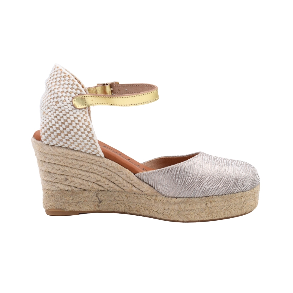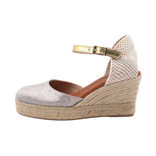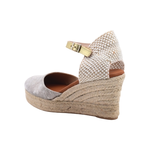 Sandalias de esparto de piel y textil en color platino para mujer.