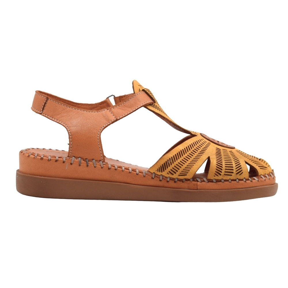Sandalias PASARELA de piel troquelada para mujer color Amarillo mostaza y marrón cuero