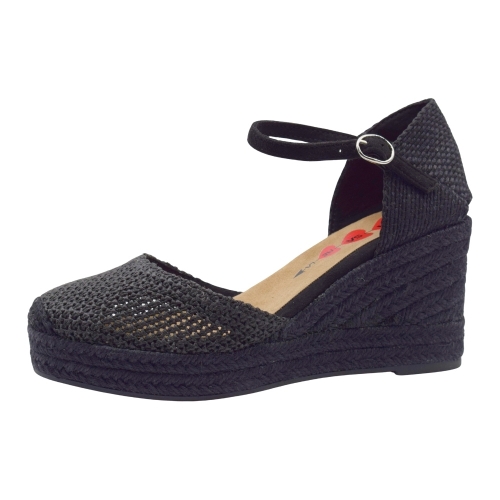 Sandalias valencianas con plataforma y cuña de esparto/yute en color Negro para mujer.