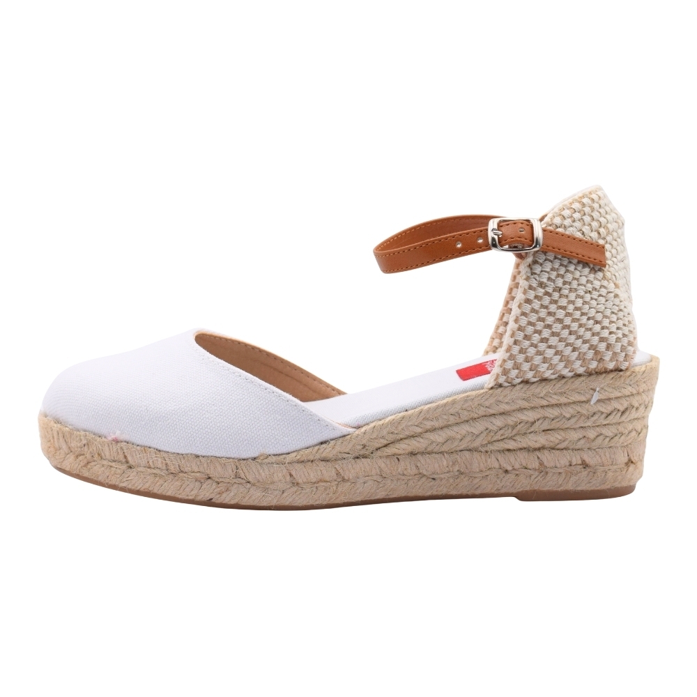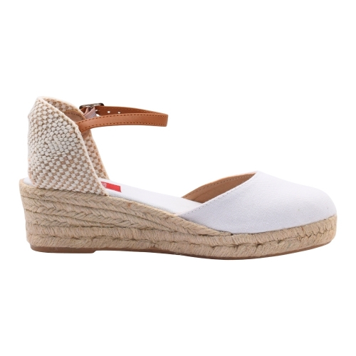 Sandalias con cuña de esparto de 3 cuerdas (3 cm + 2 cm plataforma). Fabricada en material textil. Cierre de hebilla con tira de cuero. Suela de goma antideslizante.