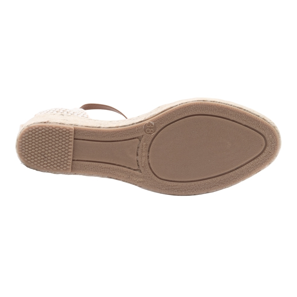 Sandalias con cuña de esparto de 3 cuerdas (3 cm + 2 cm plataforma). Fabricada en material textil. Cierre de hebilla con tira de cuero. Suela de goma antideslizante.