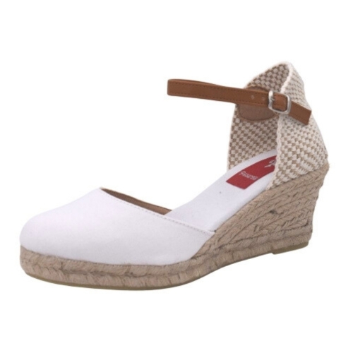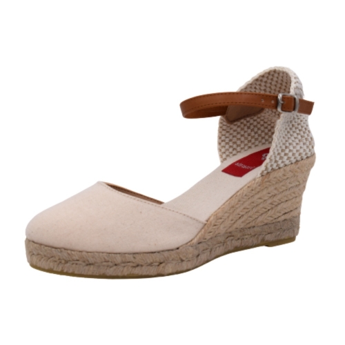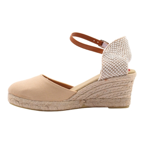 Sandalias con cuña de esparto de 5 cuerdas (5 cm + 2 cm plataforma). Fabricada en material textil. Cierre de hebilla con tira de cuero. Suela de goma antideslizante.