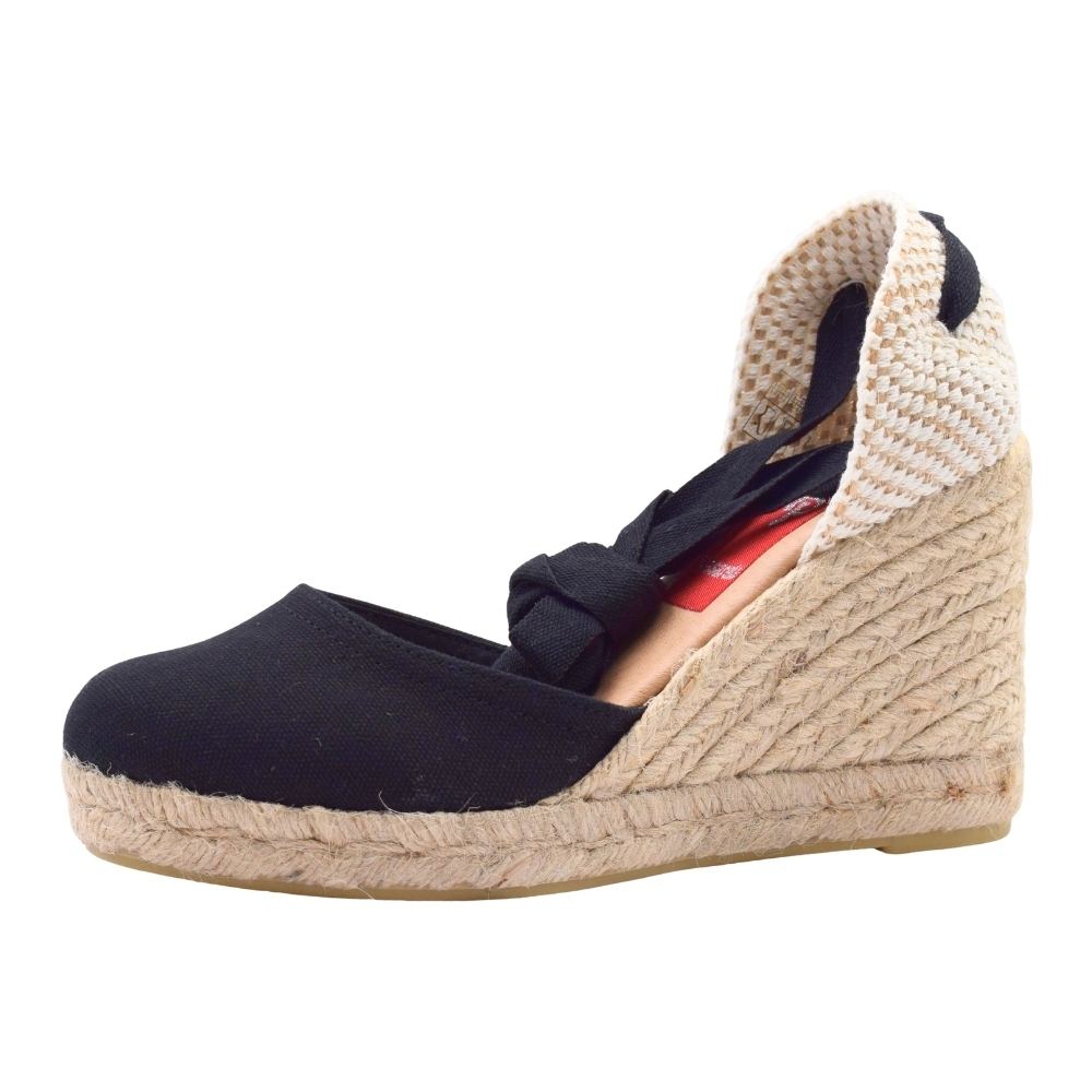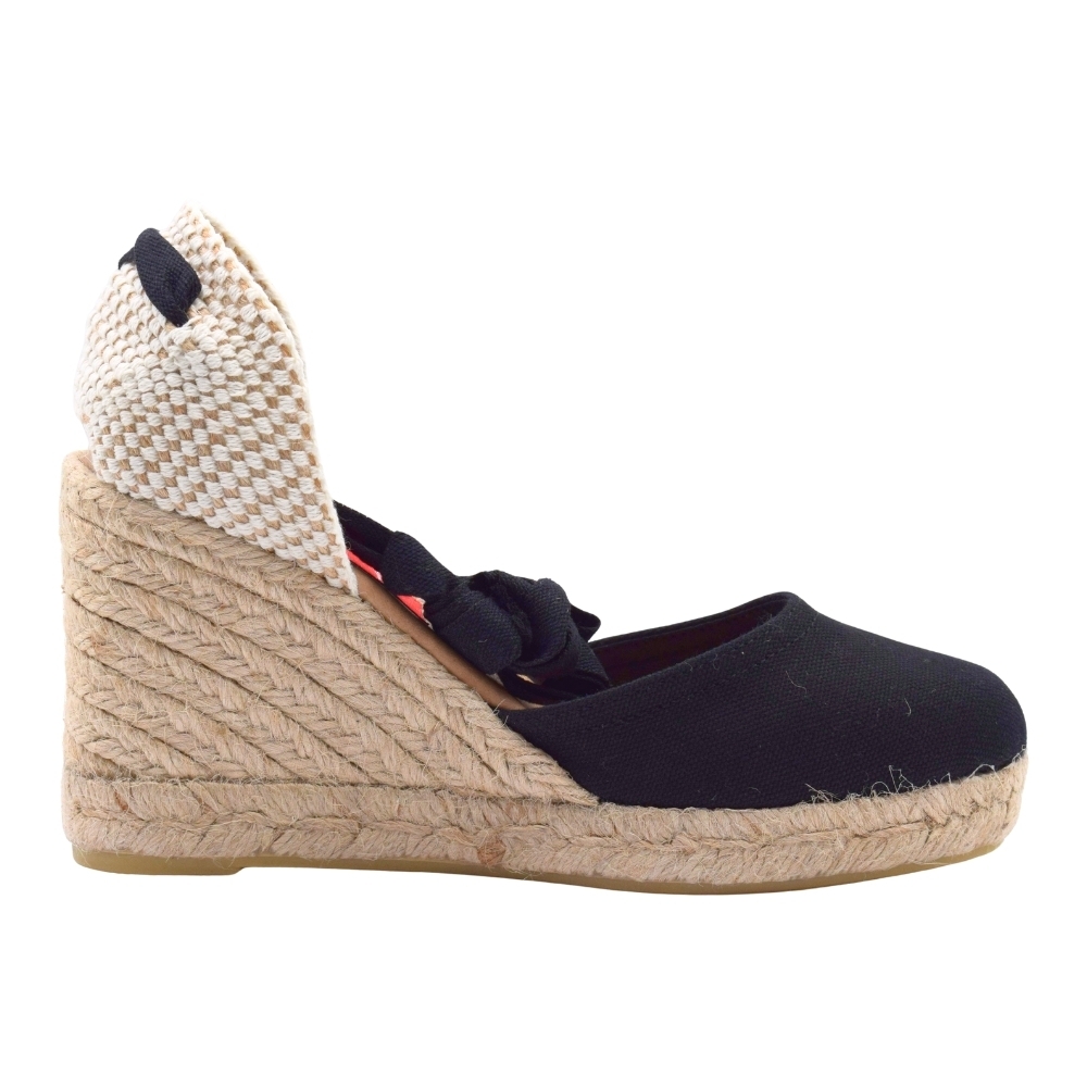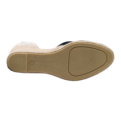 Sandalias con cuña de esparto de 7 cuerdas (7 cm + 2 cm plataforma). Fabricada en material textil. Cierre con lazos color negro. Suela de goma antideslizante.