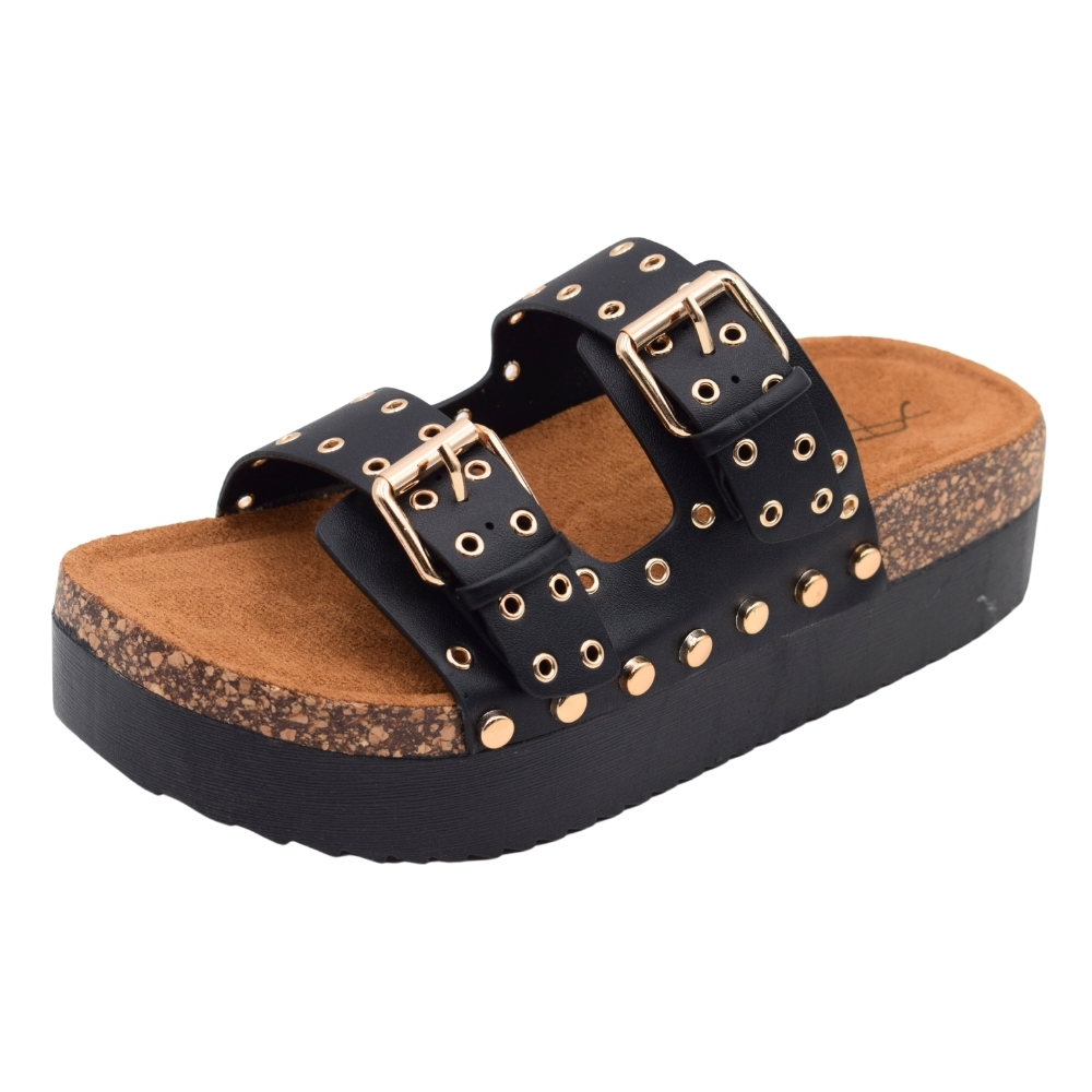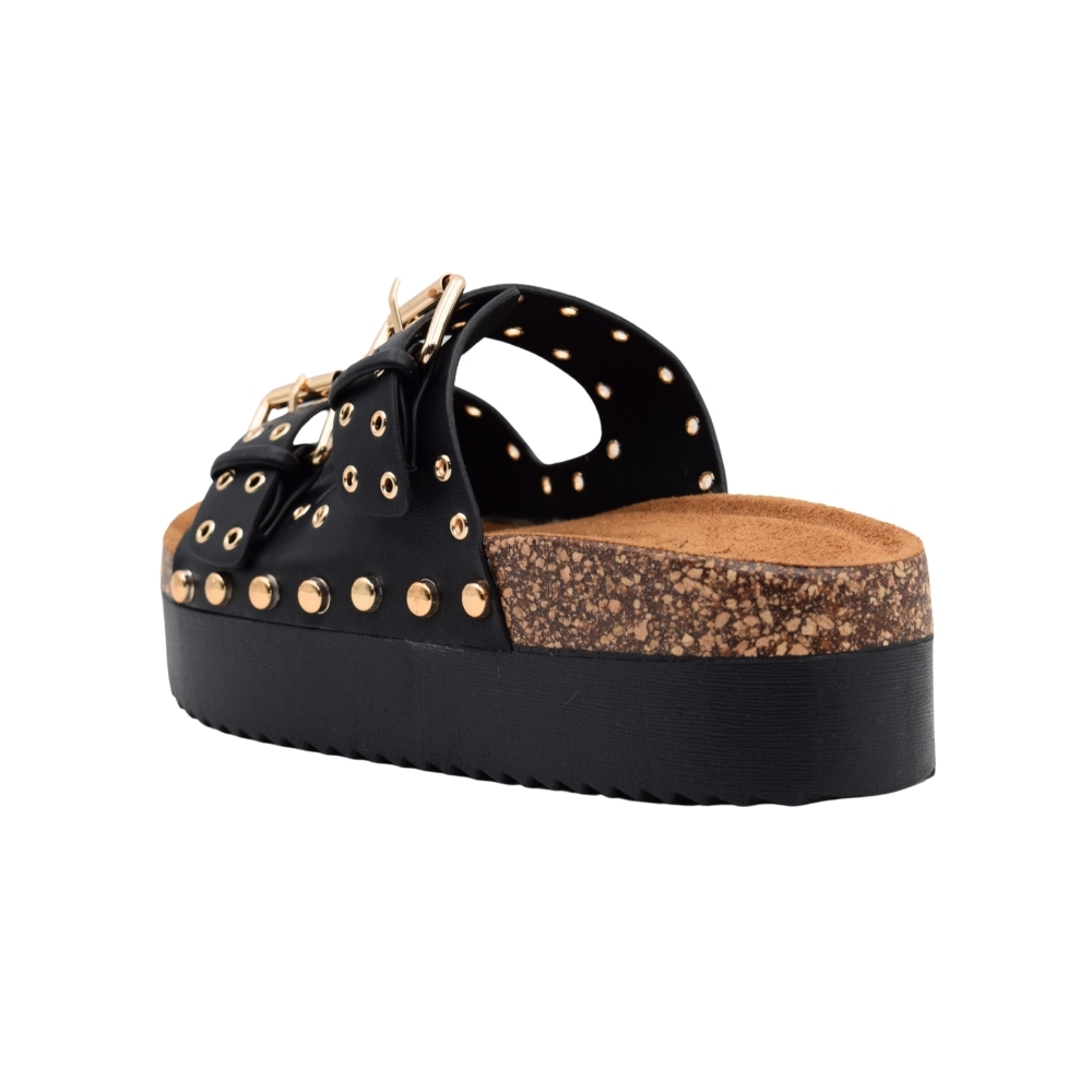 - Diseño con detalles de Hebillas ajustables en el empeine y tachuelas troqueladas en dorado